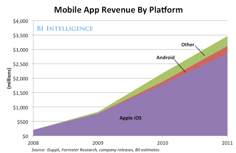 O levantamento revela uma supremacia da Apple, cuja receita acumulada desde 2008 atinge 7,15 bilhões de dólares, valor que inclui a taxa de serviço de 30% sobre os 5 bilhões pagos aos desenvolvedores.